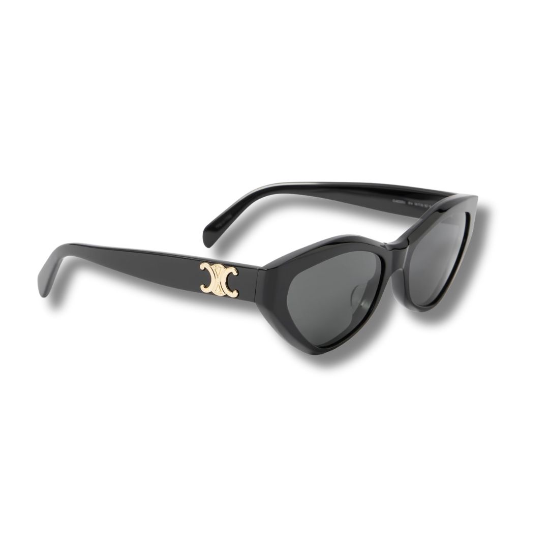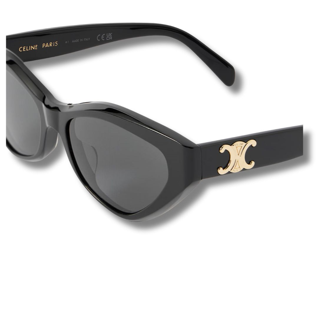 CELINE Eyewear’s Triomphe cat-eye sunglasses combine bold femininity with timeless Parisian elegance. Made in Italy from premium black acetate, this angular silhouette is finished with the house’s iconic Triomphe gold-tone metal detail at the temples.